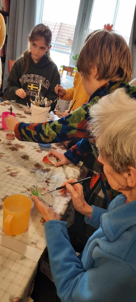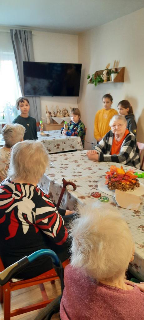 Žáci 4.B si s paní učitelkou Urbánkovou připravili program na téma Podzim. Během přibližně hodinového setkání si se skupinkou babiček a jednoho dědečka povídali o podzimu. Žáci jim vyprávěli o aktivitách, kterých se zúčastnili ve škole, a předvedli jim svoje podzimní výrobky. Senioři si poslechli hru na zobcovou flétnu a barvami si vymalovali keramický lísteček, který mohou využít jako dekoraci. Ke konci setkání si společně všichni zazpívali známé lidové písničky doprovázené hrou na akordeon.